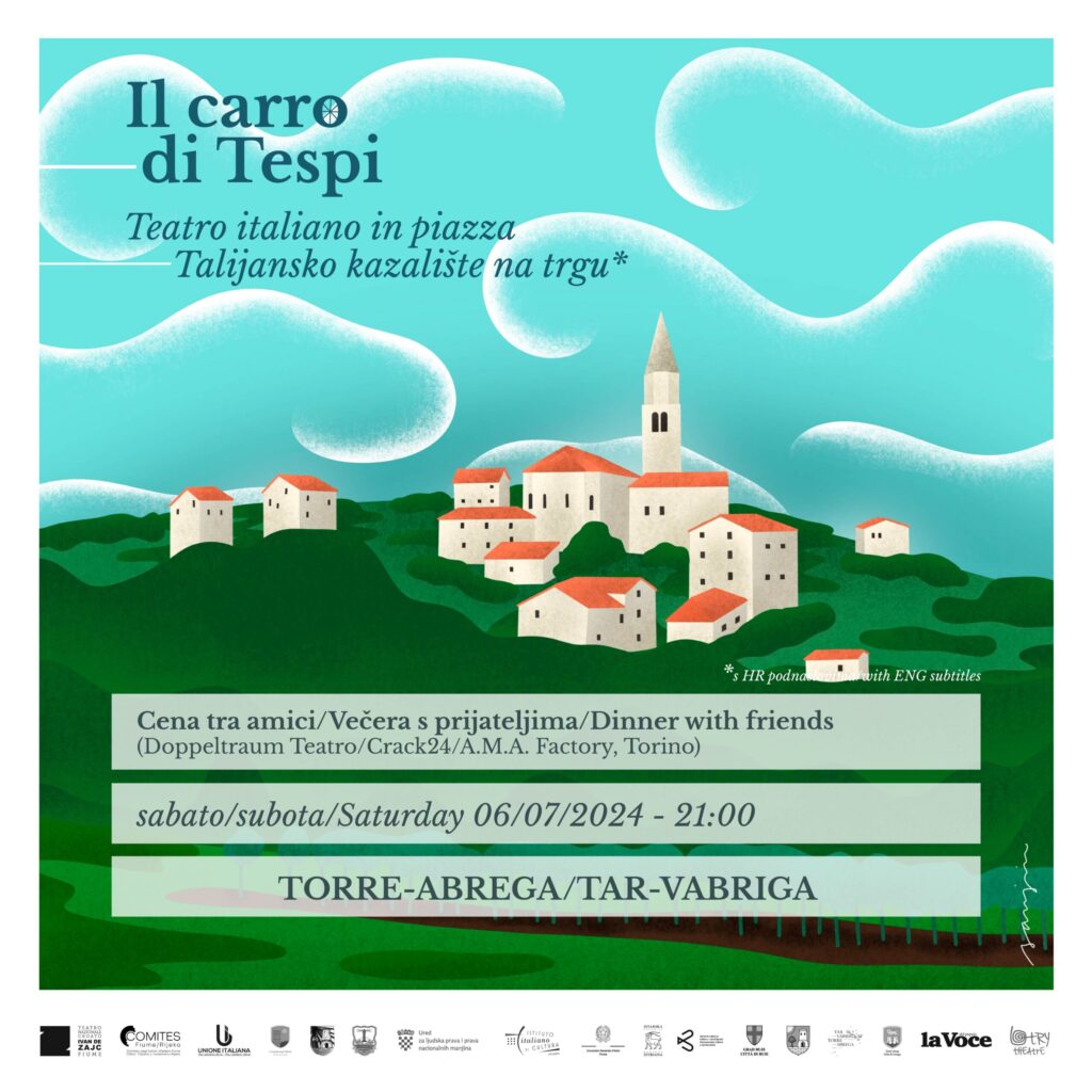 La seconda tappa del Carro di Tespi ha portato davanti alla Comunità degli Italiani di Torre lo spettacolo Cena tra amici, scritto da Matthieu Delaporte e Alexandre De La Patellière. La regia e l’interpretazione sono state firmate da Agnese Mercati, Federico Palumeri, Alessandro Cassutti, Lorenzo De Iacovo e Giulia Cerruti, con la partecipazione vocale di Matilda Leone. La scenografia è di Maurizio Fò, mentre l’assistenza tecnica è stata curata da Adriano Antonucci e Chiara Bosco.