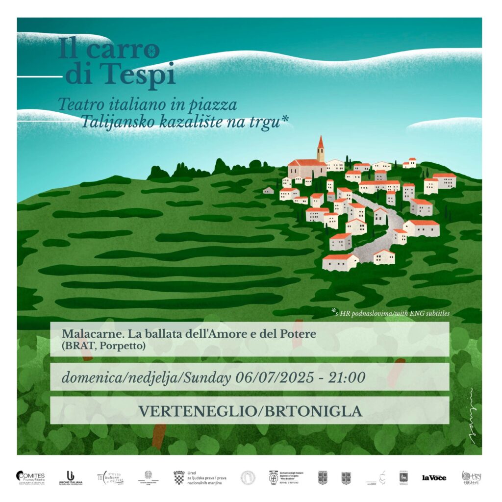 La quarta edizione della rassegna teatrale itinerante “Il Carro di Tespi – Teatro italiano in piazza”, promossa dal COMITES di Fiume, ha preso il via a Verteneglio con la pièce “Malacarne – La ballata dell’amore e del potere” della compagnia BRAT di Porpetto (Udine). Nonostante il maltempo, il teatrino della Comunità degli Italiani si è trasformato in un luogo di emozione condivisa, ospitando una performance che ha intrecciato drammaturgia, comicità e riflessione, con sottotitoli in croato e inglese.